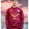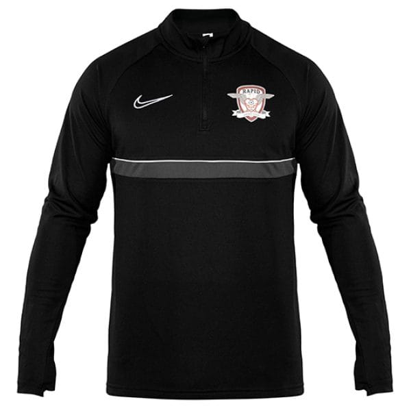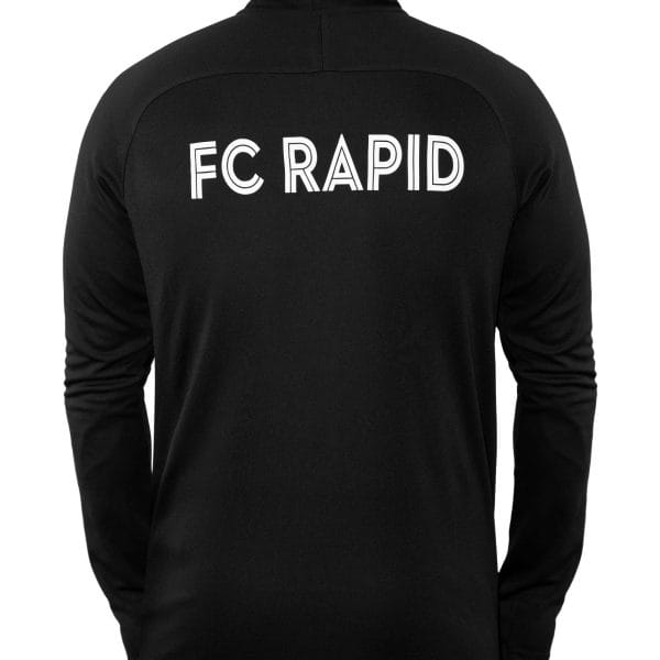 Bluza de antrenament Nike neagra cu fermoar scurt, utilizata de jucatori si staff-ul tehnic pe terenul de joc sau de pregatire, este personalizata cu stema Rapid pe piept si cu literele FC Rapid pe spate.
